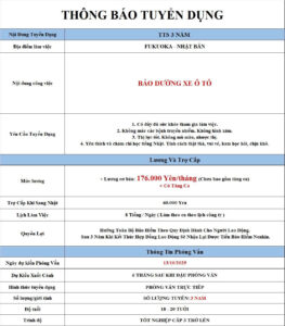Về đơn hàng Bảo dưỡng ô tô, thời gian phỏng vấn dự kiến: 13/10/2025, làm việc tại Fukuoka với chế độ đãi ngộ và các ưu điểm như sau: