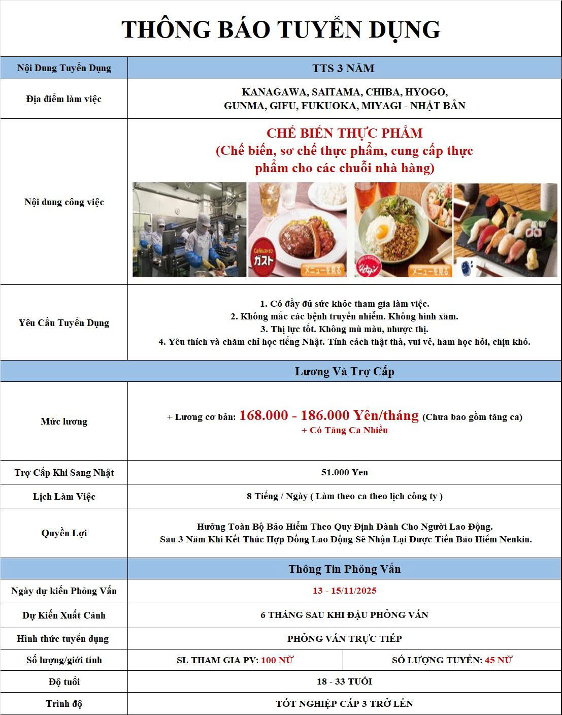 Về đơn hàng Chế biến thực phẩm, thời gian phỏng vấn dự kiến: 13-15/11/2025, làm việc tại Nhiều tỉnh với chế độ đãi ngộ và các ưu điểm như sau: