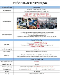 - Số lượng tuyển: 25 Nữ. Theo diện Visa thực tập sinh kỹ năng tại Nhật Bản.