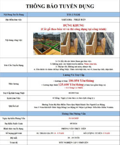 - Số lượng tuyển: 3 Nam. Theo diện Visa thực tập sinh kỹ năng tại Nhật Bản.