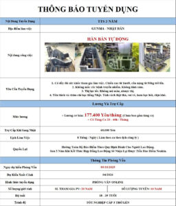 - Số lượng tuyển: 10 Nam. Theo diện Visa thực tập sinh kỹ năng tại Nhật Bản.