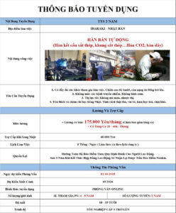 - Số lượng tuyển: 2 Nam. Theo diện Visa thực tập sinh kỹ năng tại Nhật Bản.