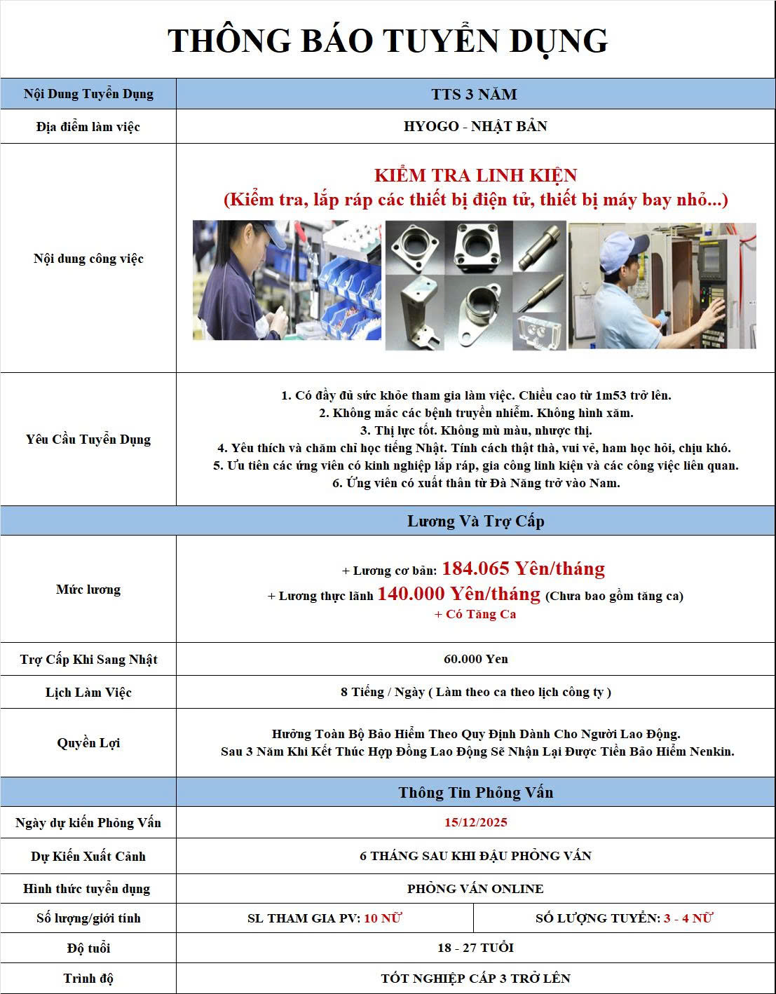 Về đơn hàng Kiểm tra linh kiện thời gian phỏng vấn dự kiến: 15/12/2025, làm việc tại Hyogo với chế độ đãi ngộ và các ưu điểm như sau: