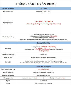 - Số lượng tuyển: 2 Nam. Theo diện Visa thực tập sinh kỹ năng tại Nhật Bản.