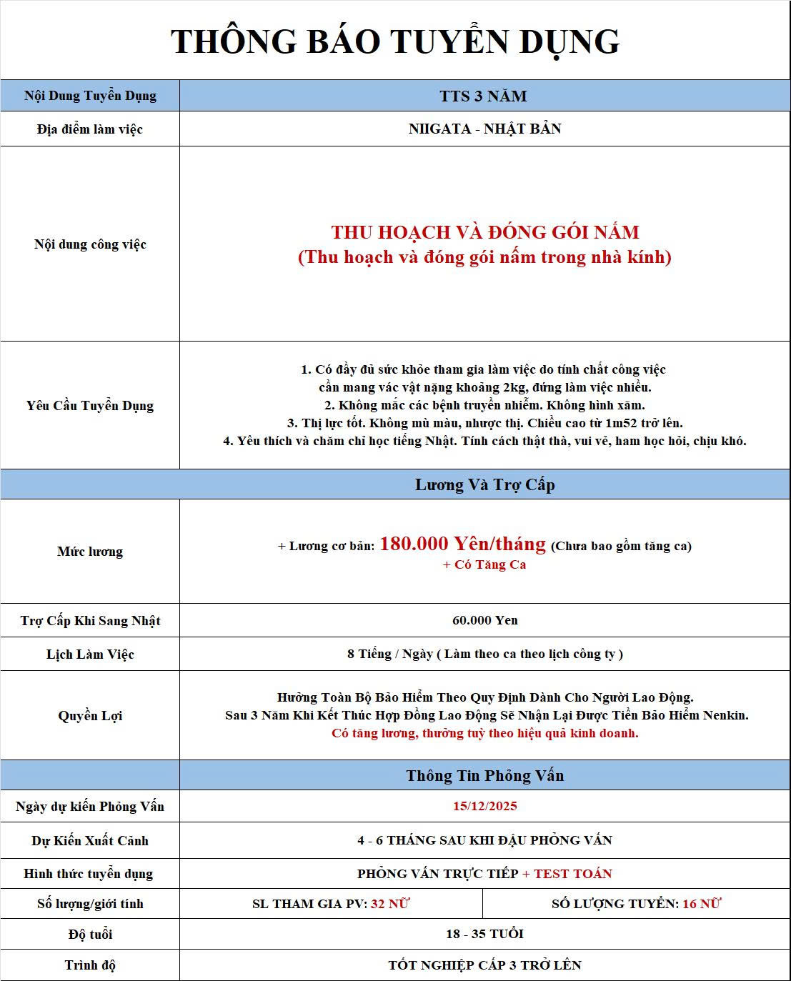 • Số lượng tuyển: 16 Nữ. Theo diện Visa thực tập sinh kỹ năng tại Nhật Bản.