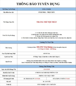 Về đơn hàng Trang trí nội thất, thời gian phỏng vấn dự kiến: 13/10/2025, làm việc tại Fukuoka với chế độ đãi ngộ và các ưu điểm như sau: